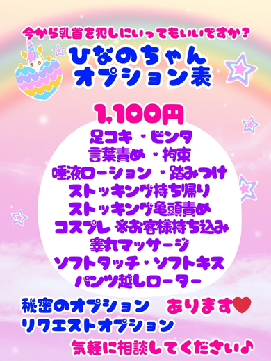 ひなのちゃんとなら、日常を忘れて夢中になれる刺激的なリフレッシュタイムを味わえることでしょう。