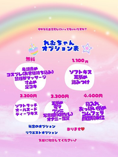 🎀れむちゃんオプション🎀 無料 亀頭責め コスプレ(お客様持ち込み) 鼠径部マッサージ 寸止め 足コキ 1,100円 ソフトキス 耳舐め 踏みつけ 2,200円 ソフトタッチ オールヌード ディープキス 3,300円 玉舐め 電マ クンニ 写真撮影(顔なし) オナニー鑑賞 4,400円 指入れ おっぱい舐め ゴムフェラ 顔面騎乗位 ↓秘密のオプション↓ あります♥ ↓リクエストオプション↓ 対応できます♥